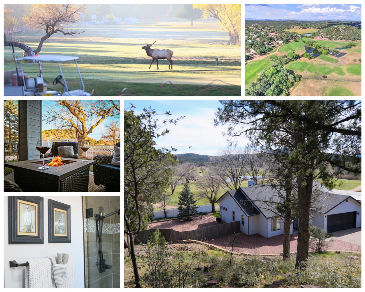 Tucked along the green at Payson Golf Course, Eagle’s Nest is a relaxing mountain retreat where wildlife often wanders just beyond the backyard. Guests love watching elk graze on the course, gathering around the fire pit in the evening, and waking up to peaceful forest views. With two master suites, adjustable beds, and a fully stocked kitchen, the home is designed for comfort whether you're visiting with family, friends, or another couple.